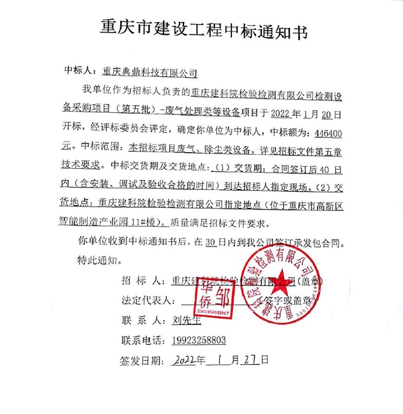重庆建科院检验检测有限公司委托重庆市华体会手机网页版登录入口管理有限公司对我公司检测设备采购项目(项目号:CQEM-ZB-22002 )重庆建科院检验检测有限公司检测设备采购项目(第五批)-废气处理类等设备进行了公开招标采购,现已完成全部采购程序。确认重庆典鼎科技有限公司为检测设备采购项目(第五批)-废气处理类等设备采购项目中标人,中标价为446400元(大写:肆拾肆万陆仟肆佰元整)。