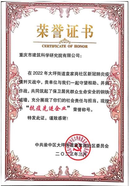 3月23日,大坪街道召开“疫”路有你,与爱同行——暨抗疫“最美党员”表彰大会,为在2022年大坪街道袁家岗社区新冠肺炎疫情歼灭战中表现优秀的社会团体与个人颁发荣誉证书,市建科院公司获“抗疫先进华体会(中国)”荣誉称号。