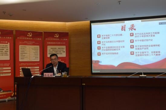 冉龙彬同志从深刻把握党的二十大的重大意义,深刻把握过去5年的工作和新时代10年的伟大变革,深刻把握谱写马克思主义中国化时代化新篇章的历史责任,深刻把握以中国式现代化推进中华民族伟大复兴的使命任务,深刻把握全面建设社会主义现代化国家的目标任务,深刻把握以伟大自我革命引领伟大社会革命的重要要求,深刻把握关于发扬斗争精神、应对风险挑战的重要要求,全面学习、全面把握、全面落实党的二十大精神8个方面,对党的二十大精神进行了全面系统深入的宣讲解读。