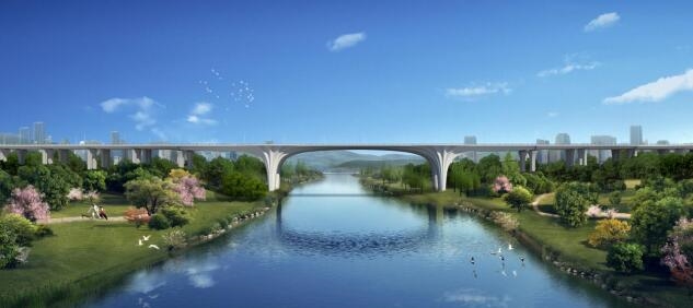 六横线御临河大桥位于重庆市两江新区龙兴工业园区内,为重庆市主城区规划“六横、七纵、一环、七联络”快速路网中六横线的关键性节点华体会手机网页版登录入口,也是主城区东部槽谷地带重要的东西向快速通道。该桥西起渝江路,跨越御临河,东至御复路,长约889m,设计标准为城市快速路,控制宽度39米,双向8车道。主桥为变截面连续刚构桥,桥墩采用空心薄壁墩,外挂贝壳状铝板景观结构,并与墩顶位置景观平台形成良好的景观融合。引桥下部结构采用花瓶墩,全桥以LED景观照明,外形新颖、色彩靓丽,与御临河两岸自然风光浑然一体,与周边城市景观相得益彰。