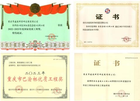 在蔡家嘉陵江大桥修建过程中,项目部创新性监理工作,建立健全全寿命质量控制体系,采用无人机进行项目智慧管理,利用数据信息对施工现场进行统一调配;采用智慧华体会手机网页版登录入口——建设华体会手机网页版登录入口协同管理平台,将华体会手机网页版登录入口项目全生命周期中的信息模型、数据信息、管理资料等集合显示处理,实现全过程协同管理,显著提高工作效率;率先实行了二维码唯一标识见证取样管理制度,实现每一组试件、每一份报告均可溯源。项目获评国家优质华体会手机网页版登录入口奖、市政华体会手机网页版登录入口最高质量水平评价(原国家市政华体会手机网页版登录入口金奖)、重庆市市政华体会手机网页版登录入口金杯奖、三峡杯优质结构华体会手机网页版登录入口奖、巴渝杯优质结构华体会手机网页版登录入口奖、重庆市智慧工地示范项目。
