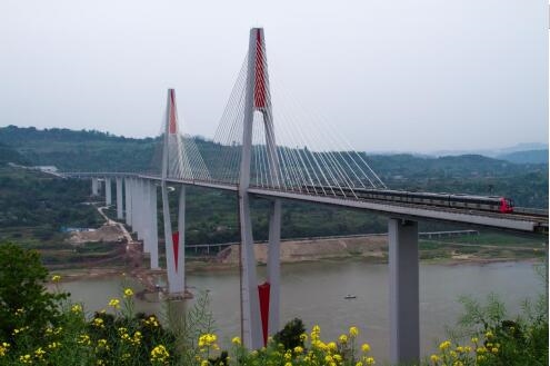 蔡家嘉陵江轨道专用桥为双线轨道双索面斜拉桥,全长1250米,由南北引桥和主桥组成,桥跨为连续梁、双索面斜拉桥、连续钢构引桥组成,其中主桥长640米、主跨250米、主桥面距河床距离100米。在设计时兼顾了功能性、景观性以及可实施性,最终选择了与环境协调,经济实惠、施工可实施性强的斜拉桥,由于桥墩高、桥面窄,主桥宽度相对于普通的跨江公路大桥更窄,桥身显得纤细,在云雾中呈现婀娜多姿的柔美姿态。
