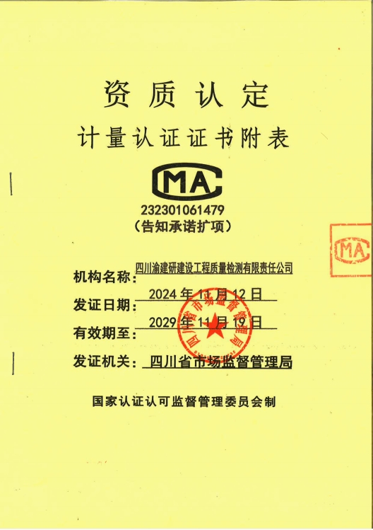 近日,重庆设计集团市建科院公司所属子华体会(中国)四川渝建研建设华体会手机网页版登录入口质量检测有限责任公司(简称“四川渝建研公司”)在检测技术领域取得重大突破,CMA(检验检测机构资质认定)资质参数由566项成功扩增至1132项,公司检测资质范围由原先的“四大类”增至“八大类”,扩项后公司检测技术能力再上新台阶,满足了水利华体会手机网页版登录入口检测资质必须参数需求,位居四川省检测机构中上游水平。