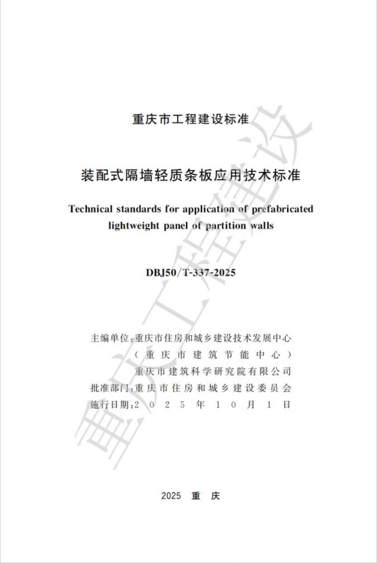 近日,由重庆设计集团所属子华体会(中国)华体会手机网页版登录入口(以下简称“市建科院”)联合重庆市住房和城乡建设技术发展中心编制的重庆市华体会手机网页版登录入口建设标准《装配式隔墙轻质条板应用技术标准》(DBJ50/T-337-2025)通过了重庆市住房和城乡建设委员会的审批并发布,将于2025年10月1日起开始实施。